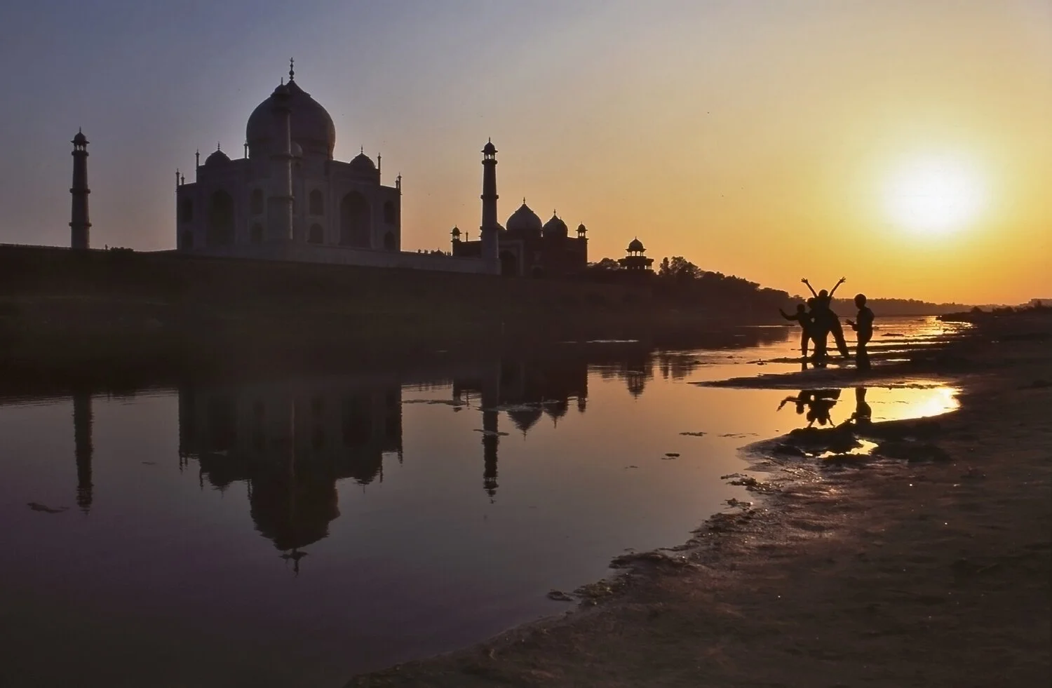 We decided to stay where we were for a couple more hours until sunset , wanting to get the best shot. At 6pm the sun hit the horizon and then ... yes the kids turned up again! Having great fun jumping into or frames. Which was at first a little annoying and then I thought, no amazing! Let them jump! After 15 or so frames the sun went down. We then saw a man in boat and paid him R40 to row us across the river to the back of the Taj and we jumped out in the grounds of the Taj just before it shut for the night! ”